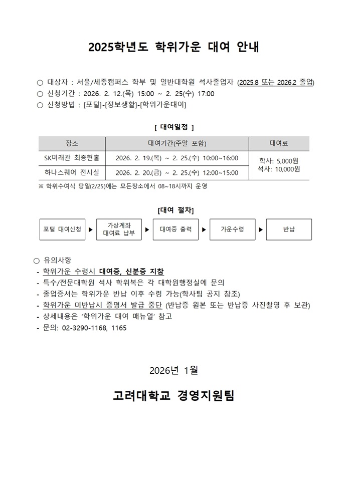 | 제목 | [졸업] 2025학년도 학위가운 대여 안내 |