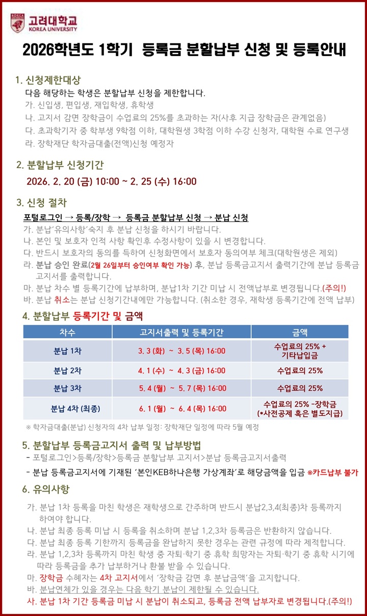 | 제목 | 2026년 1학기 대학(원) 등록금 분할납부 신청 및 등록 안내 |